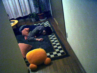 My husband loves to take a rest on the hot carpet rather than in the bed.