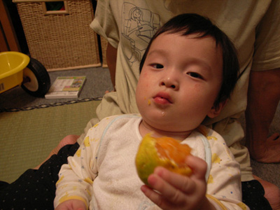 みかんを吸っているところ。最初皮ごとガブリと食べてしまい、すごい顔をしていた。