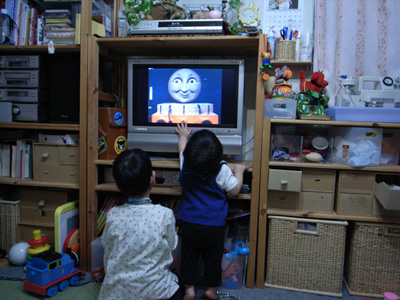トーマスにくぎ付けな二人。りょーたがすぐテレビ前に陣取るので、颯太までテレビ前に出てきてしまう。